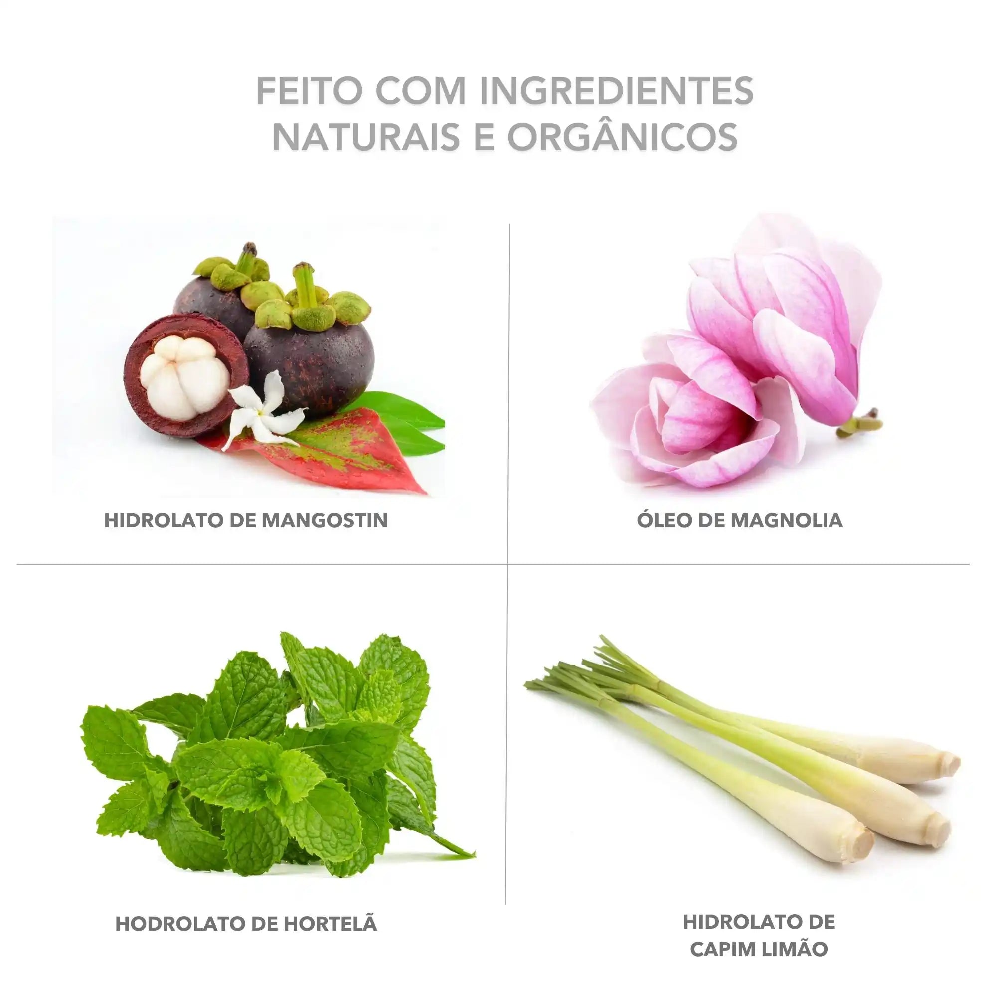 água, extrato de garcínia mangostana hidrolisada, fermento de saccharomyces / zinco, magnolol / honoquiol, glicerol, caprilil / capril glucosídeo, hidrolato de capim-limão, hidrolato de hortelã, éster funcional de xilitol