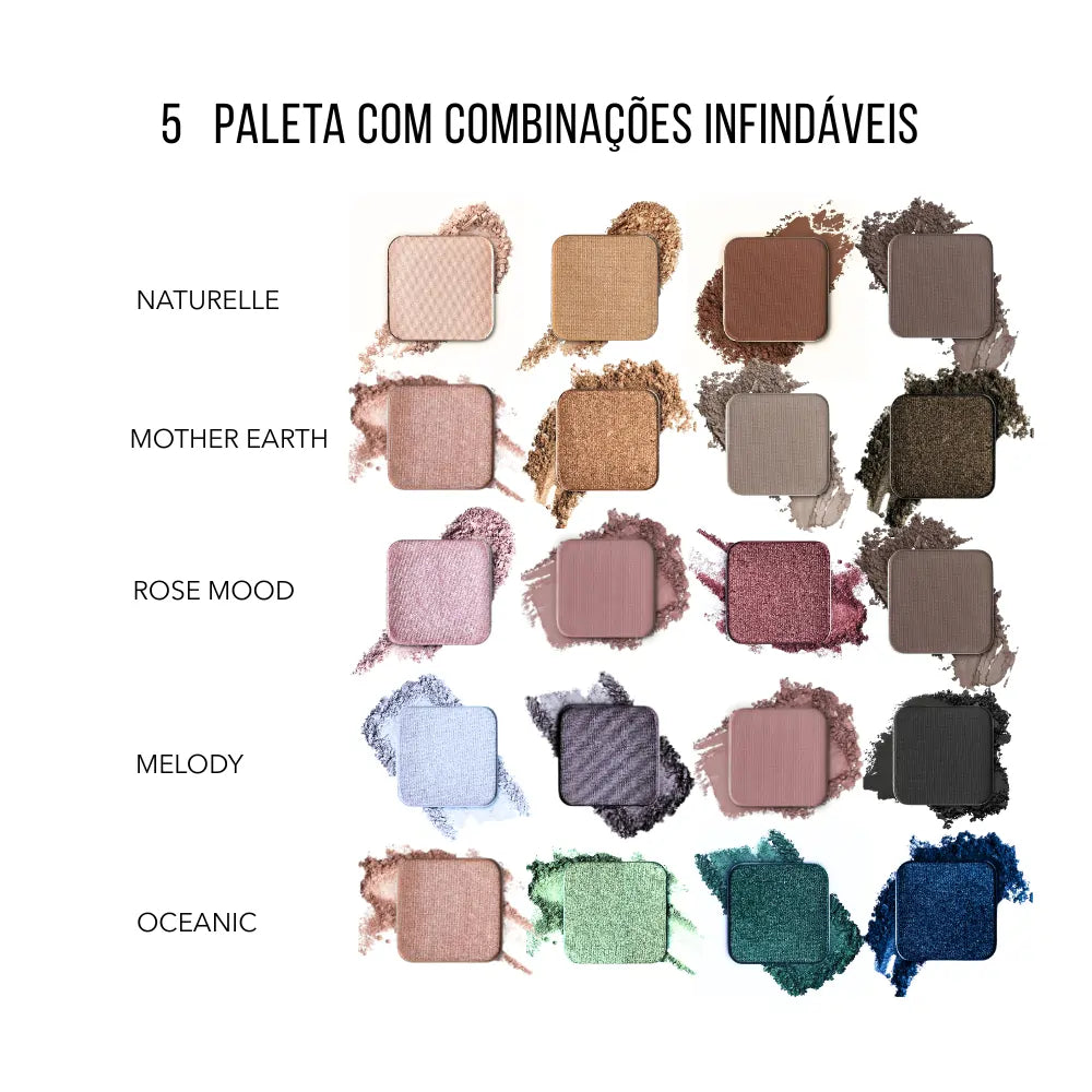 - Nossas 5 paletas tem 4 cores neutras, marcantes e clássicas e podem ser usadas para criar infinitos looks básicos para o dia e mais intensos para noite