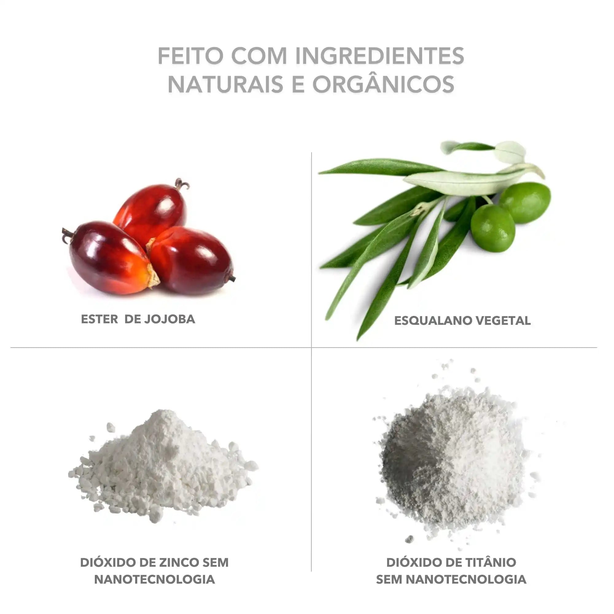 água, cocoato de butilenoglicol, óxido de zinco, esqualano, dióxido de titânio, cera de carnaúba, poligliceril-6 poli-hidroxiestearato, poligliceril-6 poli-ricinoleato, alumina, caprilil glicol, sulfato de magnésio, cloreto de sódio, ácido caprilhidroxâmico, glicerol, ésteres de jojoba, ácido estearoil glutâmico, dextroalfatocoferol (vitamina e natural), palmitato de ascorbila