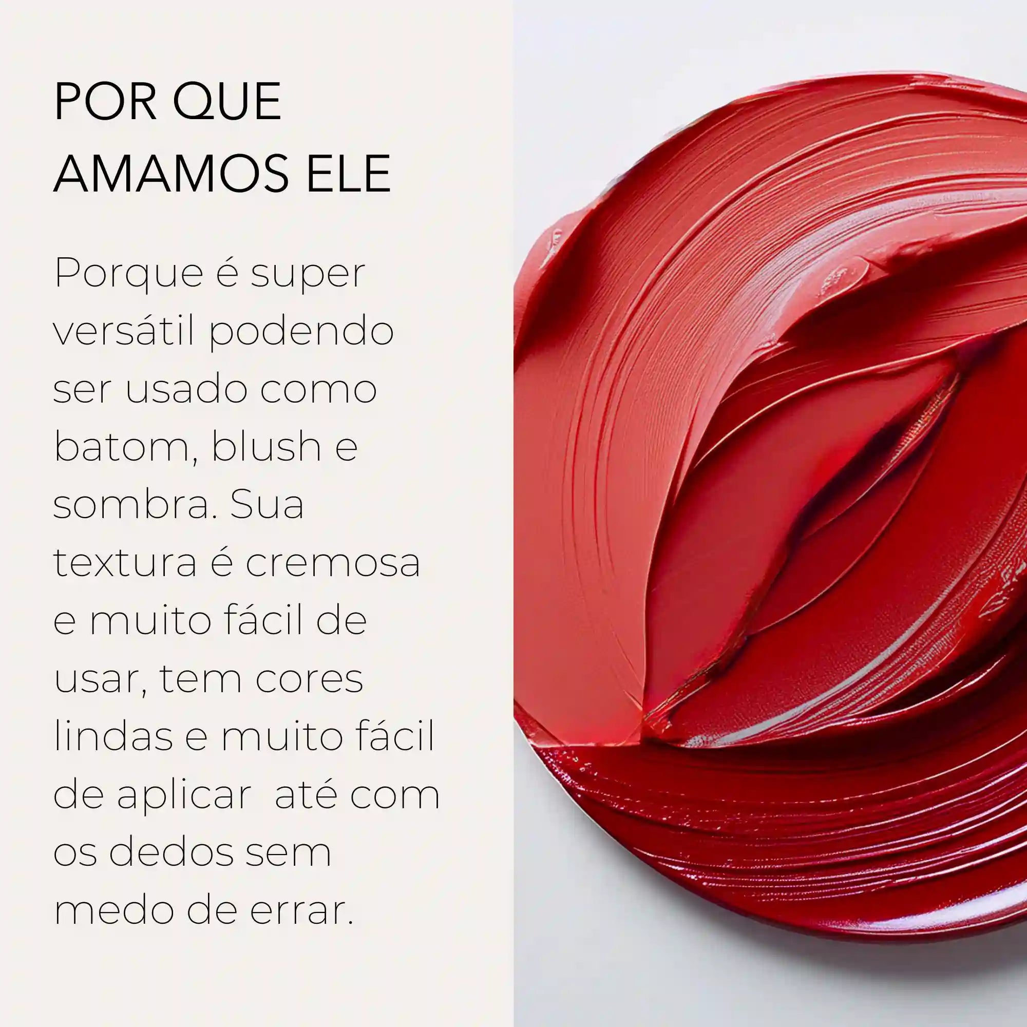 - Produto multifuncional para ser usado como sombra, batom ou blush