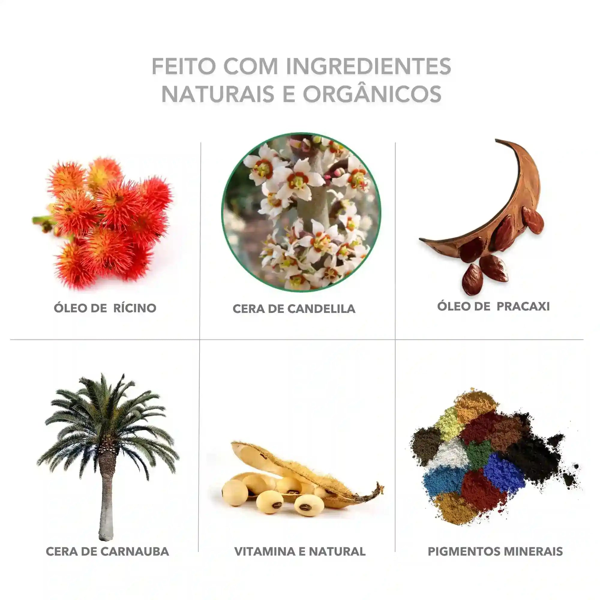 octildodecanol, óleo de rícino*, laurato de isoamila, mica, cera de carnaúba*, cera de candelila, fragrância, lecitina, óleo de pracaxi*, dextroalfatocoferol (vitamina e natural), palmitato de ascorbila, ácido cítrico