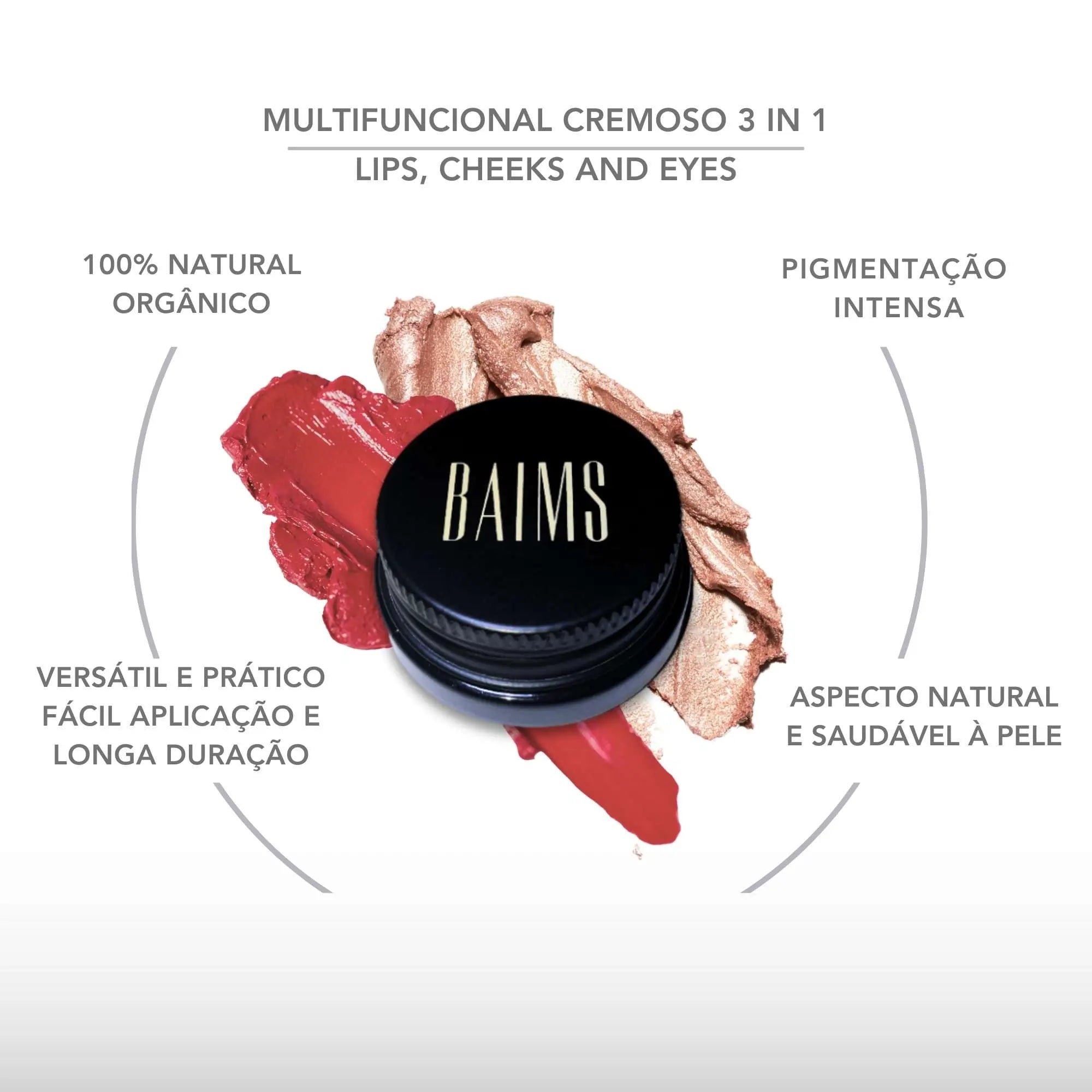 - Produto multifuncional para ser usado como sombra, batom ou blush