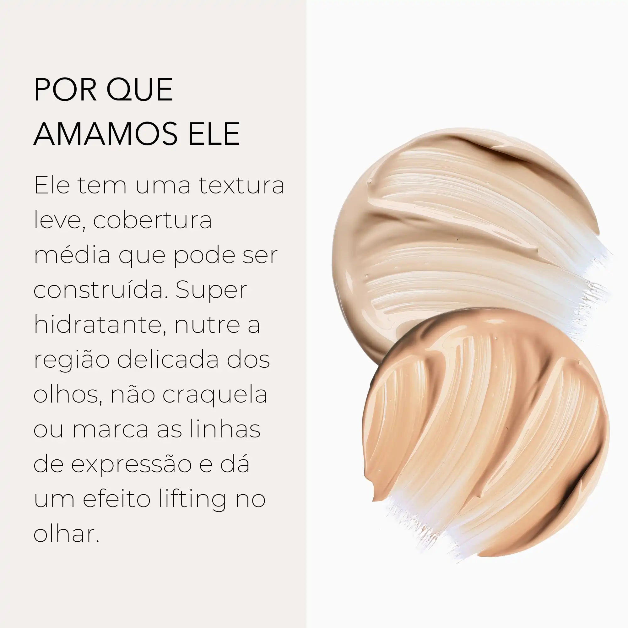 - Textura leve, cremosa e ricamente pigmentada, ele disfarça olheiras e ruguinhas, pequenas manchas de sol e espinhas